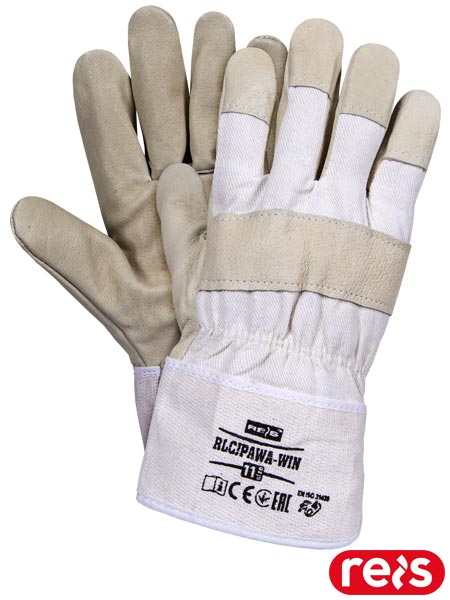 Rękawice ochronne wzmacniane skórą świńską.- skóra świńska licowa- drelich w kolorze białym- ocieplane kożuszkiem- całodłonicowe - część chwytna rękawicy wykonana z jednego kawałka skóry, dzięki czemu wykazują większą wytrzymałość i odporność na przetarcia- popularnie stosowane do ogólnych prac mechanicznych- wykorzystywane w budownictwie, przemyśle ciężkim