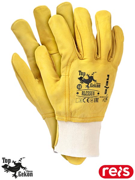 Rękawice ochronne wykonane ze skóry w żółtym kolorze.- skóra kozia licowa- całodłonicowe - część chwytna rękawicy wykonana z jednego kawałka skóry, dzięki czemu wykazują większą wytrzymałość i odporność na przetarcia- całoskórzane, czyli w całości wykonane ze skóry- zakończone elastycznym ściągaczem, dzięki czemu świetnie trzymają się na dłoni- dodatkowa skórzana ochrona na puls- wysoka jakość skóry tworzy te rękawice bardzo wytrzymałymi i odpornymi na zużycie- popularnie stosowane do ogólnych prac mechanicznych- wykorzystywane w budownictwie, przemyśle ciężkim