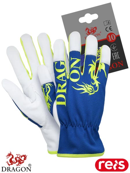 Rękawice ochronne wykonane z wysokiej jakości skóry koziej.- skóra kozia licowa w jasnych kolorach- wierzch wykonany z elastycznej tkaniny spandex w niebieskim kolorze, dzięki czemu idealnie dopasowują się do dłoni- miękka kozia skóra wysokiej jakości zapewnia doskonały komfort pracy i zadowolenie nawet najbardziej wymagającego klienta- marszczenie w nadgarstku sprawia, że rękawice lepiej przylegają do dłoni- popularnie stosowane do ogólnych prac mechanicznych- każda para posiada zawieszkę, dzięki czemu świetnie się prezentują i są idealne na wszelkiego rodzaju prezentacje