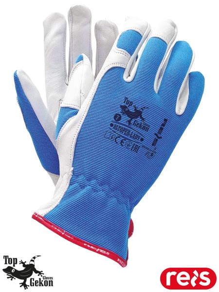 Rękawice ochronne wykonane z wysokiej jakości skóry koziej.- skóra kozia licowa w jasnych kolorach- wierzch wykonany z elastycznej tkaniny w niebieskim kolorze, dzięki czemu idealnie dopasowują się do dłoni- miękka kozia skóra wysokiej jakości zapewnia doskonały komfort pracy i zadowolenie nawet najbardziej wymagającego klienta- marszczenie w nadgarstku sprawia, że rękawice lepiej przylegają do dłoni- idealne dla kobiet- popularnie stosowane do ogólnych prac mechanicznych