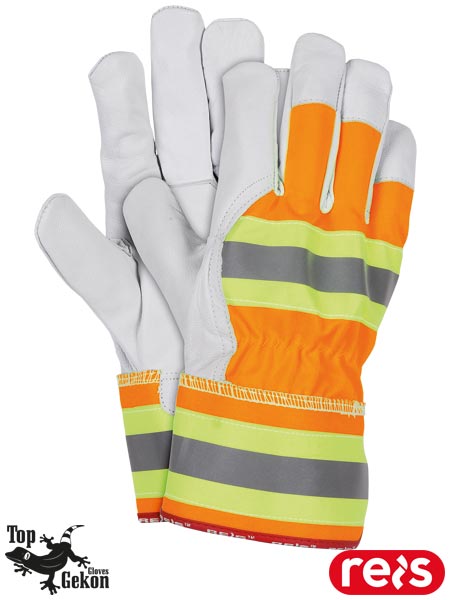 Rękawice ochronne wykonane ze skóry koziej.- skóra kozia licowa w jasnych kolorach- część wierzchnia wykonana we fluorescencyjnym kolorze, zwiększającym widoczność użytkownika- mankiet usztywniony w kolorze fluorescencyjnym- całodłonicowe - część chwytna rękawicy wykonana z jednego kawałka skóry, dzięki czemu wykazują większą wytrzymałość i odporność na przetarcia- od wewnątrz wypodszewkowane, co podnosi komfort użytkowania- popularnie stosowane do ogólnych prac mechanicznych- wykorzystywane w budownictwie, przemyśle ciężkim- idealne dla drogowców