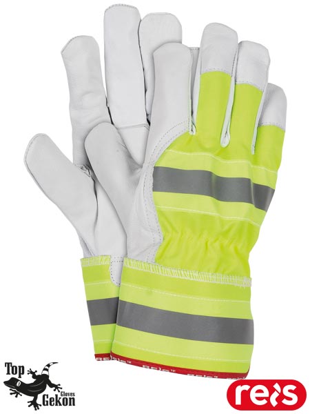 Rękawice ochronne wykonane ze skóry koziej.- skóra kozia licowa w jasnych kolorach- część wierzchnia wykonana we fluorescencyjnym kolorze, zwiększającym widoczność użytkownika- mankiet usztywniony w kolorze fluorescencyjnym- całodłonicowe - część chwytna rękawicy wykonana z jednego kawałka skóry, dzięki czemu wykazują większą wytrzymałość i odporność na przetarcia- od wewnątrz wypodszewkowane, co podnosi komfort użytkowania- popularnie stosowane do ogólnych prac mechanicznych- wykorzystywane w budownictwie, przemyśle ciężkim- idealne dla drogowców