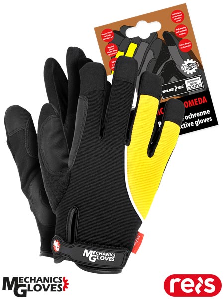 Rękawice ochronne wykonane z wysokiej jakości miękkiej skóry syntetycznej połączonej z tkaniną.- część wierzchnia wykonana ze streczu- gumowe naszycia na części chwytnej chronią przed odgnieceniami i zwiększają chwytność trzymanych przedmiotów- tkanina frotte na kciuku zbierająca pot- dodatkowe wzmocnienie pomiędzy kciukiem a palcem wskazującym- w nadgarstku zapięcie na rzep velcro, które umożliwia wygodną regulację- wstawka z żółtego materiału na części wierzchniej rękawicy wraz z odblaskowym paskiem zwiększa widoczność- wykorzystywane w przemyśle motoryzacyjnym- chętnie używane przez sportowców- każda para posiada zawieszkę, dzięki czemu świetnie się prezentują i są idealne na wszelkiego rodzaju prezentacje