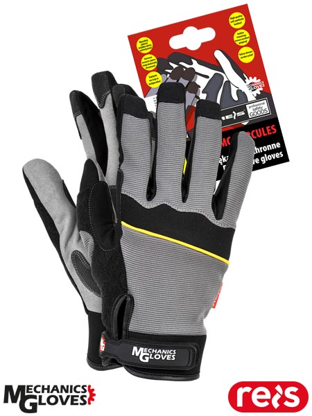Rękawice ochronne.- wykonane ze skóry syntetycznej w połączeniu z dzianiną stretch 95% poliester, 5% elastan- wstawki: dzianina neoprenowa oraz dzianina frotte 85% bawełna, 15% poliester- dodatkowe wzmocnienie pomiędzy kciukiem a palcem wskazującym ze skóry syntetycznej- gumowe naszycia na części chwytnej i końcówkach palców zapewniające doskonałą chwytność trzymanych przedmiotów- mankiet zakończony zapięciem na rzep velcro, który umożliwia dopasowanie rękawicy- wysoka jakość skóry tworzy te rękawice bardzo wytrzymałymi i odpornymi na zużycie- popularnie stosowane do ogólnych prac mechanicznych- każda para posiada zawieszkę, dzięki czemu świetnie się prezentują i są idealne na wszelkiego rodzaju prezentacje
