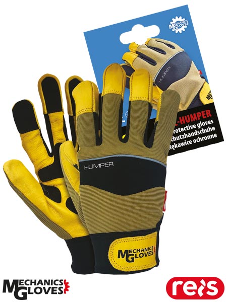 Rękawice ochronne wykonane ze skóry koziej połączonej z tkaniną.- skóra kozia licowa w żółtym kolorze- część wierzchnia wykonana z materiału spandex oraz neoprenu- odblaskowy pasek zwiększa widoczność- całodłonicowe - część chwytna rękawicy wykonana z jednego kawałka skóry, dzięki czemu wykazują większą wytrzymałość i odporność na przetarcia- na części chwytnej od wewnątrz dodatkowe wstawki materiału, zapobiegające tworzeniu się odcisków i otarć- w nadgarstku pasek wykonany z miękkiego neoprenu z zapięciem na rzep, umożliwiającym wygodną regulację- popularnie stosowane do ogólnych prac mechanicznych- każda para posiada zawieszkę, dzięki czemu świetnie się prezentują i są idealne na wszelkiego rodzaju prezentacje