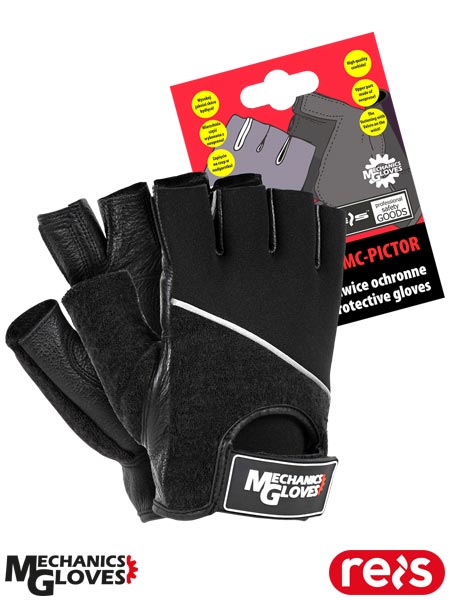 Rękawice ochronne.- wykonane z skóry bydlęcej licowej w połączeniu z dzianiną neoprenową- dzianina frotte 85% bawełna, 15% poliester na kciuku zbierająca pot- bez końcówek na palcach- mankiet zakończony zapięciem na rzep velcro, które umożliwia wygodną regulację- biała lamówka na części wierzchniej- wysoka jakość skóry tworzy te rękawice bardzo wytrzymałymi i odpornymi na zużycie- idealne do przenoszenia przedmiotów, gdy wymagane jest czucie w palcach- wykorzystywane w przemyśle motoryzacyjnym- chętnie używane przez sportowców np. na siłowni- każda para posiada zawieszkę, dzięki czemu świetnie się prezentują i są idealne na wszelkiego rodzaju prezentacje