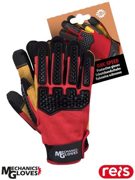 Rękawice ochronne wykonane z wysokiej jakości skóry koziej połączonej z oddychającym materiałem spandex.- część wierzchnia wykonana z czterokierunkowego spandexu w kolorze czerwonym- część chwytna wykonana ze skóry koziej- dodatkowe wstawki z TPR na kostkach i palcach zabezpiczają przed urazami oraz otarciami- na części chwytnej i końcówkach trzech palców dodatkowe wzmocnienie z PCV- wzmocnienie ze skóry koziej pomiędzy kciukiem a palcem wskazującym- w nadgarstku pasek wykonany z miękkiego neoprenu z zapięciem na rzep, umożliwiającym wygodną regulację- popularnie stosowane do ogólnych prac mechanicznych- każda para posiada zawieszkę, dzięki czemu świetnie się prezentują i są idealne na wszelkiego rodzaju prezentacje- zgodne z normą EN ISO 21420