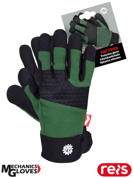 Rękawice ochronne wykonane z wysokiej jakości skóry syntetycznej połączonej z oddychającym materiałem spandex.- część wierzchnia wykonana z czterokierunkowego spandexu w kolorze zielonym- na części chwytnej powlekane silikonowym wzorem zapewniającym doskonałą chwytność- na końcówkach palców oraz pomiędzy kciukiem a palcem wskazującym dodatkowe wzmocnienia co zwiększa wytrzymałość rękawicy- bardzo wytrzymałe i odporne na zużycie dzięki wysokiej jakości materiału- popularnie stosowane do ogólnych prac mechanicznych- każda para posiada zawieszkę, dzięki czemu świetnie się prezentują i są idealne na wszelkiego rodzaju prezentacje- zgodne z normą EN ISO 21420