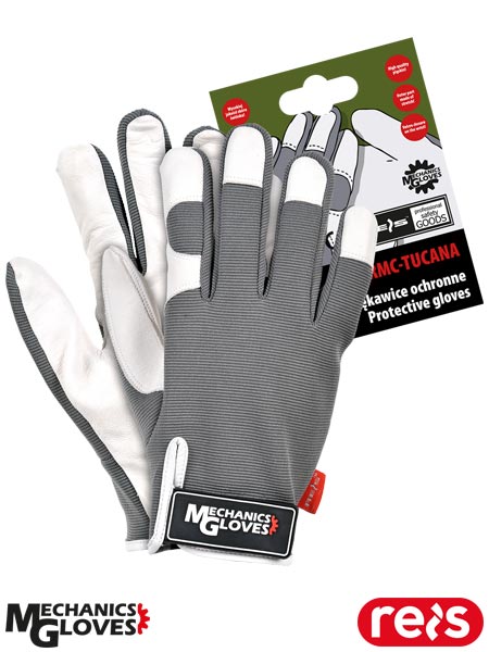 Rękawice ochronne.- wykonane ze skóry świńskiej licowej w połączeniu z elastyczną dzianiną stretch 95% poliester, 5% elastan- całodłonicowe - część chwytna rękawicy wykonana z jednego kawałka skóry, dzięki czemu wykazują większą wytrzymałość i odporność na przetarcia- mankiet zakończony zapięciem na rzep velcro, które umożliwia wygodną regulację- popularnie stosowane do ogólnych prac mechanicznych- każda para posiada zawieszkę, dzięki czemu świetnie się prezentują i są idealne na wszelkiego rodzaju prezentacje