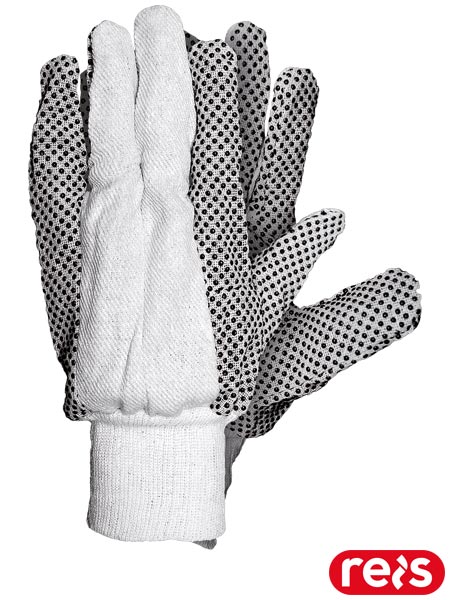 Rękawice ochronne wykonane z drelichu z nakropieniem.- 100% bawełna- nakropienie z PCV na części chwytnej oraz na małym i wskazującym palcu- zakończone ściągaczem- idealne do przenoszenia przedmiotów śliskich, gdzie wymagana jest dobra chwytność