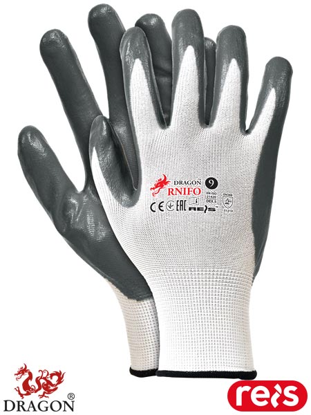 Rękawice ochronne.- dzianina: 100% nylon (ścieg 13)- powlekane spienionym nitrylem typu FOAM- zakończone ściągaczem- charakteryzują się zwiększoną odpornością na ścieranie i przetarcie- zapewniają manualność oraz doskonałe czucie trzymanego przedmiotu- nitryl zwiększa odporność na smary i oleje, a technologia FOAM zwiększa elastyczność rękawicy- sprawdzają się w miejscach, gdzie następuje kontakt z wyżej wymienionymi substancjami- wykorzystywane do ogólnych prac mechanicznych- przeznaczone do prania- po praniu zachowują swoje parametry ochronne