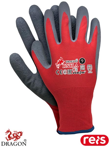 Rękawice ochronne.- dzianina: 100% nylon (ścieg 13)- powlekane lateksem o chropowatej strukturze- zakończone ściągaczem- lateks wykazuje odporność na detergenty oraz kwasy- zarówno dzianina jak i oblanie odporne na rozdarcie, rozciągliwe i wytrzymałe, mimo iż są cienkie- elastyczne, dzięki czemu świetnie dopasowują się do dłoni- zapewniają doskonałą manualność przy ograniczeniu ślizgania się trzymanego przedmiotu- potocznie zwane blue-bird