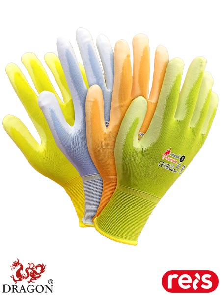 Rękawice ochronne.- dzianina: 100% nylon w jaskrawych kolorach (ścieg 13)- powlekane poliuretanem- zakończone ściągaczem- charakteryzują się zwiększoną odpornością na ścieranie i rozdarcie- zapewniają manualność oraz doskonałe czucie trzymanego przedmiotu- wykazują bardzo dużą elastyczność, a tym samym odporność na rozciąganie oraz świetnie dopasowują się do dłoni- wykorzystywane do ogólnych prac mechanicznych szczególnie tam, gdzie wymagana jest manualność- w opakowaniu mix kolorów: żółty, zielony, pomarańczowy oraz błękitny