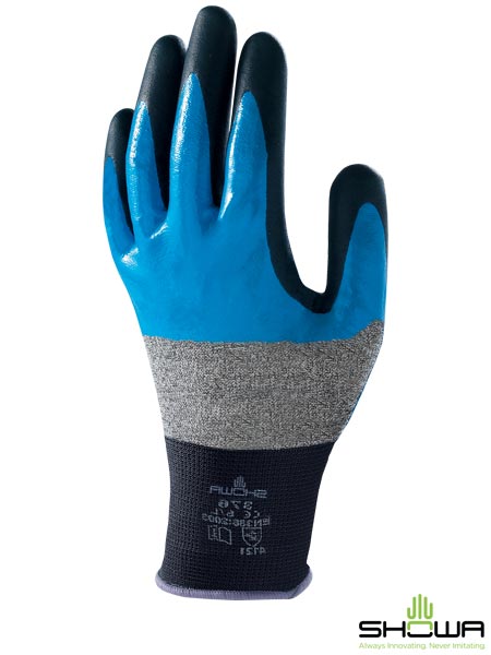 Rękawice nitrylowe SHOWA 376R.- wykonane z mieszanki poliestru i nylonu, zostały w 75% pokryte podwójną pianką nitrylową, co znacznie zwiększa ich wytrzymałość na działanie substancji chemicznych- w części chwytnej zastosowano innowacyjną, podwójną warstwę pianki nitrylowej, gwarantującą pewność uchwytu- elastyczny ściągacz stabilnie utrzymuje rękawice na dłoniach- długość rękawic wynosi od 22 do 27, w zależności od wybranego rozmiaru- znajdują zastosowanie w ciężkich pracach o średnim zagrożeniu suche i olejowe środowisko- zgodne z normami EN 420, EN388:2016 (4 1 2 1 X)