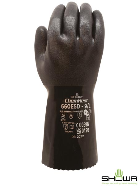 Rękawice SHOWA 660 ESD.- elektrostatyczne i chemoodporne- wykonane z dzianiny bawełnianej, która jest powlekana PCV- wysoka odporność na ścieranie, ochrona przed kwasami, zasadami, rozpuszczalnikami oraz substancjami alkoholowymi- doskonałe do pracy w wilgotnym środowisku, anatomiczny kształt- znajdują zastosowanie w strefach zagrożonych wybuchem, w przemyśle petrochemicznym, morskim, chemicznym oraz budownictwie