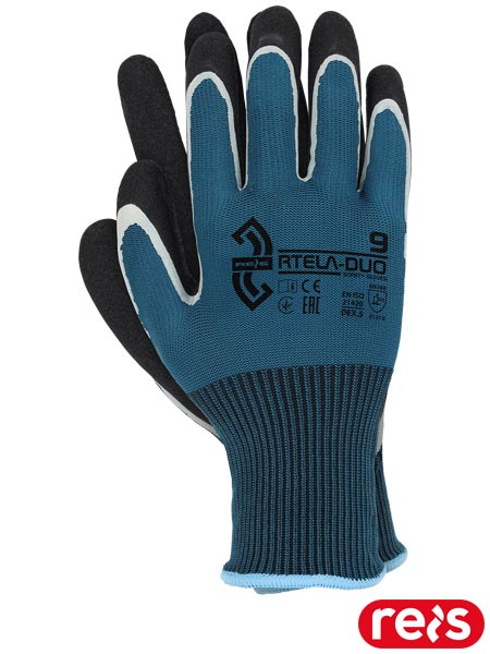 Rękawice ochronne.- dzianina: 100% poliester (ścieg 13)- powlekane podwójnie lateksem, pierwsza warstwa typu smooth, druga lateks o chropowatej strukturze zapewniającej doskonałą chwytność, nie powodując usztywnienia rękawicy- zakończone ściągaczem- odporne na ścieranie i rozdarcie- rozciągliwe i wytrzymałe, mimo iż są cienkie- zapewniają manualność- wykazują bardzo dużą elastyczność oraz świetnie dopasowują się do dłoni