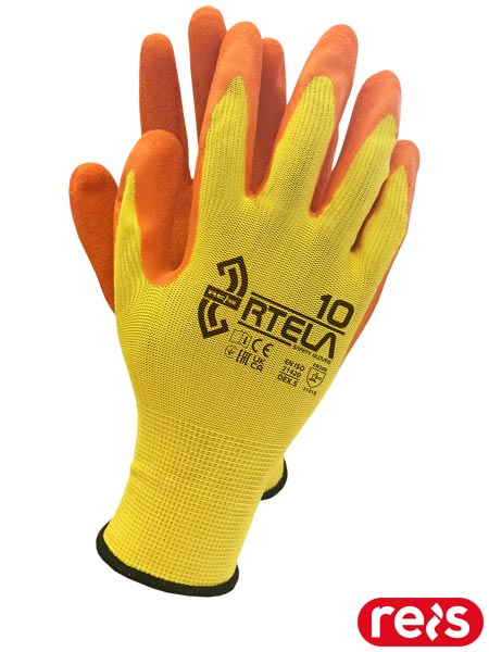 Rękawice ochronne.- dzianina: 100% poliester (ścieg 13)- powlekane lateksem o chropowatej strukturze zapewniającej doskonałą chwytność, nie powodując usztywnienia rękawicy- zakończone ściągaczem- odporne na ścieranie i rozdarcie- rozciągliwe i wytrzymałe, mimo iż są cienkie- wykazują bardzo dużą elastyczność oraz świetnie dopasowują się do dłoni- nie kurczą się w kontakcie z wodą oraz zapewniają doskonałą manualność przy ograniczeniu ślizgania się trzymanego przedmiotu- stosowane jako zamiennik dla rękawic RNYLA