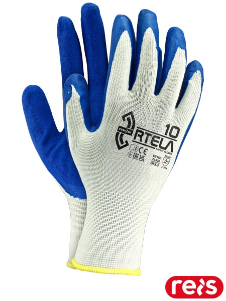 Rękawice ochronne.- dzianina: 100% poliester (ścieg 13)- powlekane lateksem o chropowatej strukturze zapewniającej doskonałą chwytność, nie powodując usztywnienia rękawicy- zakończone ściągaczem- odporne na ścieranie i rozdarcie- rozciągliwe i wytrzymałe, mimo iż są cienkie- wykazują bardzo dużą elastyczność oraz świetnie dopasowują się do dłoni- nie kurczą się w kontakcie z wodą oraz zapewniają doskonałą manualność przy ograniczeniu ślizgania się trzymanego przedmiotu- stosowane jako zamiennik dla rękawic RNYLA