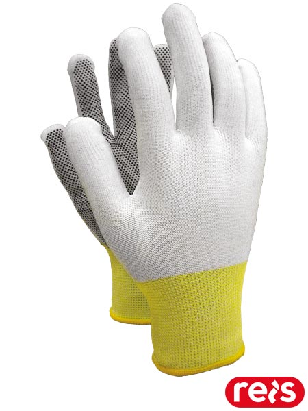 Rękawice ochronne.- dzianina: 100% poliester (ścieg 13)- jednostronne mikronakropienie z PCV na części chwytnej- zakończone ściągaczem- elastyczne dzięki czemu świetnie dopasowują się do dłoni- dostępne ze ściągaczem w kolorze: rozmiar 7 - zielonym, 8 - czerwonym, 9 - niebieskim, 10 - żółtym- przeznaczone do ogólnych prac mechanicznych, znajdują zastosowanie w przemyśle transportowym oraz budownictwie