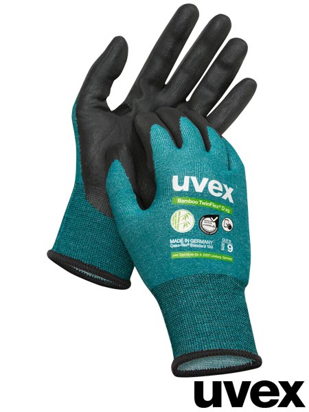 Rękawice ochronne Bamboo TwinFlex® D xg.- dzianina: wiskoza bambusowa, elastan, polietylen (HPPE), poliamid-rezyclat (PA), stal- powlekane pianką polimerową Xtra Grip- zakończone ściągaczem- elastyczne - dopasowują się do każdego kształtu ręki po 3-5 minutach noszenia- wzmocnienie - uvex protexxion w obszarze pomiędzy kciukiem a palcem wskazującym zapewnia, w porównaniu z wewnętrzną częścią rękawicy, dwukrotnie większą odporność na ścieranie (200%), a tym samym zwiększa żywotność / trwałość rękawicy- wykonana w 45% ze zrównoważonych materiałów: poliamid z recyklingu i wiskoza bambusowa oparta na surowcach odnawialnych- odporne na ciepło kontaktowe do 100°C