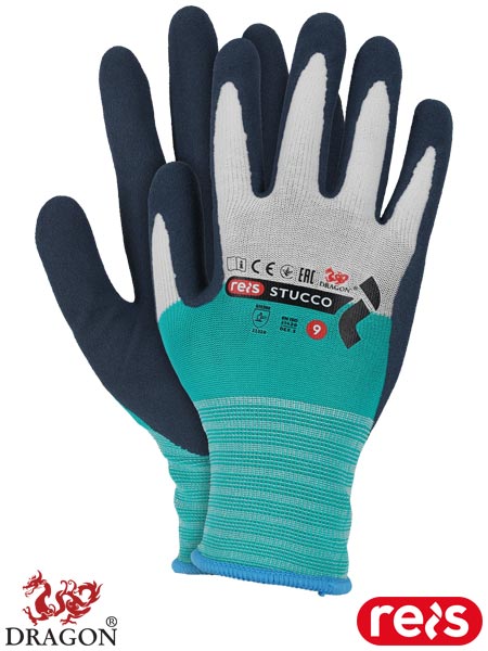 Rękawice ochronne.- dzianina: 100% poliester pochodzący z recyklingu (ścieg 15)- powlekane lateksem typu SANDY FINISH- zakończone ściągaczem- odporne na ścieranie i rozdarcie- wykazują bardzo dużą elastyczność oraz świetnie dopasowują się do dłoni- wykorzystywane w budownictwie oraz przemyśle transportowym