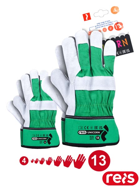 Rękawice ochronne wzmacniane skórą bydlęcą.- skóra bydlęca dwoinowa- mankiet usztywniony w kolorze zielonym- całodłonicowe - część chwytna wykonana z jednego kawałka skóry, dzięki czemu wykazują większą wytrzymałość i odporność na przetarcia- wysoka jakość skóry tworzy te rękawice bardzo wytrzymałymi i odpornymi na zużycie- popularnie stosowane do ogólnych prac mechanicznych- wykorzystywane w budownictwie, przemyśle ciężkim