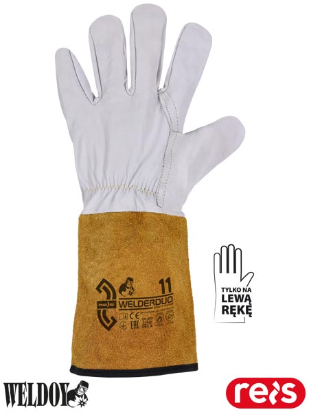 Rękawica spawalnicza na lewą rękę.- skóra bydlęca dwoinowa w kolorze miodowym połączona ze skórą kozią licową- długość rękawicy 35 cm- szyte trudnopalnymi i odpornymi na gorąco nićmi z kevlaru- całodłonicowe - część chwytna wykonana z jednego kawałka skóry licowej, dzięki czemu wykazują większą wytrzymałość i odporność na przetarcia- znajdują zastosowanie w miejscach, gdzie istnieje ryzyko iskrzenia- odporne na ciepło kontaktowe do 250°C- klasyfikacja TYP A/B