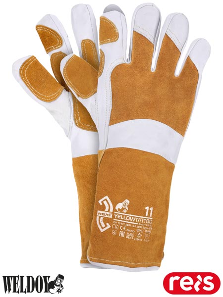 Rękawice spawalnicze.- skóra bydlęca dwoinowa w kolorze miodowym połączona ze skórą bydlęcą licową- długość rękawicy 35 cm- szyte trudnopalnymi i odpornymi na gorąco nićmi z kevlaru- część chwytna dodatkowo wzmocniona skórą bydlęcą, dzięki czemu rękawica jest odporniejsza na przetarcie i zużycie- całoskórzana, czyli w całości wykonane ze skóry, włącznie z mankietem sięgającym do połowy przedramienia, chroniąc w ten sposób przed przemiękaniem oraz zabezpieczając nadgarstek przed urazami- znajdują zastosowanie w miejscach, gdzie istnieje ryzyko iskrzenia- odporne na ciepło kontaktowe do 100°C- klasyfikacja TYP A/B
