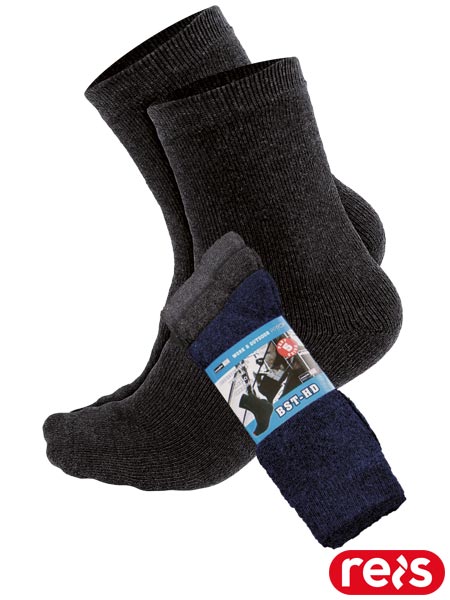 Skarpety do pracy i codziennego użytku.- 52% bawełna, 46% poliester, 2% elastan- dostępne w kolorach: szarym (2 pary), czarnym (2 pary) oraz granatowym (1 para)- zapewniają komfort i satysfakcję użytkowania, dzięki wysokiej jakości wykonania- umieszczone na małej zawieszce, która umożliwia wygodną prezentację na wystawie- najmniejsza jednostka sprzedaży 5 par