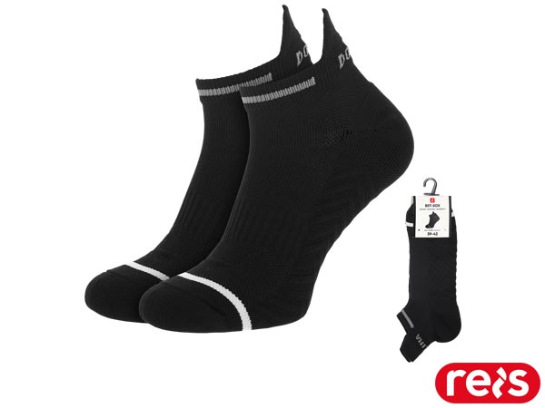 Skarpety.- dzianina: 72% bawełna, 25% poliester, 3% elastan- waga pary około 40 g- system kanalików wentylacyjnych wspomaga utrzymanie optymalnej wymiany powietrza, odprowadzając wilgoć oraz nadmiar powietrza- pięta uformowana w kształt litery Y poprawia przyleganie skarpety do stopy, zapobiega zsuwaniu się- płaski szew na palcach zapewniający komfort użytkowania- nieuciskający ściągacz z anatomicznym mankietem chroniącym ścięgna Achillesa- doskonale sprawdzą się zarówno w trakcie pracy, treningów, jak i codziennych aktywności- umieszczone na małej zawieszce, która umożliwia wygodną prezentację na wystawie