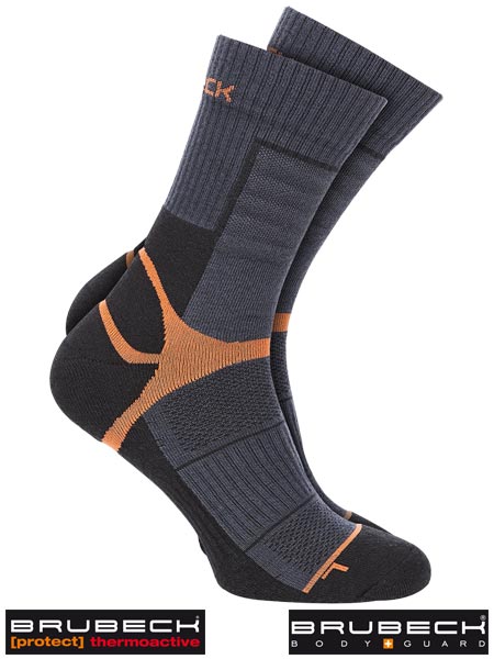 Termoaktywne skarpety BRUBECK®.- 46% poliester, 25% polipropylen, 19% bawełna, 7% poliamid, 3% elastan- dwuwarstwowa konstrukcja skarpet została oparta na modyfikowanych włóknach polipropylenowych wzbogaconych środkiem antybakteryjnym- wytrzymałe włókna poliestrowe wraz z wysokiej jakości miękką bawełną, zapewniają skuteczny transport wilgoci oraz wyjątkową wytrzymałość i komfort- wewnętrzne wykończenie frotte w okolicy palców, na spodzie stopy oraz pięcie zapewnia skuteczną ochronę przed urazami i otarciami oraz gwarantuje komfort cieplny- cieńsza dzianina pod palcami skutecznie chroni przed powstaniem pęcherzy i otarć- frotte w przedniej części piszczela oraz w okolicach stawu skokowego amortyzuje ucisk języka i sznurowadeł, a także chroni przed otarciem i pęcherzami- wysoki, prążkowany, elastyczny ściągacz zabezpiecza przed zsuwaniem się skarpety z łydki, nie ograniczając krążenia krwi- specjalna konstrukcja wokół kostki STICK SYSTEM zapobiega przesuwaniu się skarpety na boki, utrzymując ją we właściwej pozycji- dodatkowe wzmocnienie w postaci bezuciskowego ściągacza MIDDLE ZONE w środkowej części śródstopia zapobiega przesuwaniu się skarpety na stopie- w części śródstopia graniczącej z palcami oraz na podbiciu stopy znajdują się strefy wykonane z cieńszej dzianiny o strukturze siatkowej (konstrukcja PIQUE), wspomagające cyrkulację powietrza i transport wilgoci- testowana na zawartość szkodliwych dla zdrowia substancji zgodnie ze standardami OEKO-TEX® Standard 100