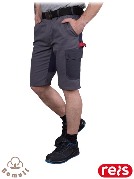 Spodnie ochronne do pasa BOMER z krótkimi nogawkami.- tkanina: 100% bawełna o gramaturze 260 g/m2- wstawki z granatowego materiału 62% poliester, 34% bawełna, 4% elastan o gramaturze 240 g/m2- dwie boczne oraz dwie tylne kieszenie- trzy kieszenie na nogawkach, w tym jedna zapinana na rzep- gumka w pasie w bocznych partiach zwiększa swobodę ruchów oraz umożliwia lepsze dopasowanie- uchwyt na młotek na lewej nogawce- dzięki zastosowaniu spandexu spodnie lepiej dopasowują się do sylwetki, jednocześnie nie krępując ruchów- idealne na upalne dni