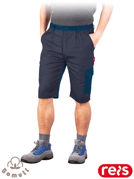 Spodnie ochronne do pasa z krótkimi nogawkami BOMULL.- tkanina: 100% bawełna- gramatura 260-270 g/m2- zapinane na guziki- możliwość regulacji w pasie dzięki gumce w bocznych partiach- sześć kieszeni: dwie boczne, dwie tylne na rzep oraz dwie na nogawkach w tym jedna na rzep