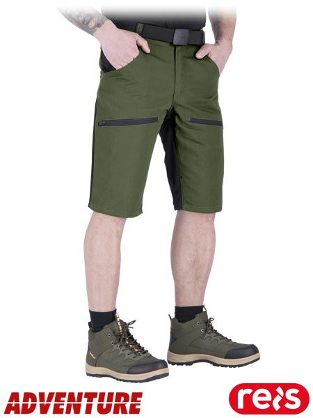 Spodnie ochronne do pasa HOBBER z krótkimi nogawkami, męskie.- materiał główny: tkanina o splocie canvas 65% poliester, 35% bawełna o gramaturze 260 g/m2- wstawki na kolanach, przy górnych bocznych kieszeniach oraz w tylnej części: elastyczny materiał 94% poliamid, 6% elastan o gramaturze 270 g/m2- zapinane na guzik oraz zamek błyskawiczny- dwie boczne kieszenie oraz dwie tylne kieszenie zapinane na suwak z dodatkowymi patkami- kieszenie na nogawkach zapinane na suwak- gumka w pasie w tylnej partii umożliwiająca lepsze dopasowanie- idealne zarówno do pracy, jak i codziennego użytku
