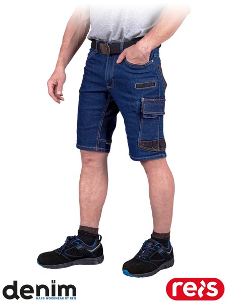 Elastyczne spodnie ochronne do pasa z krótkimi nogawkami, męskie.- tkanina jeansowa: 78% bawełna, 20% poliester, 2% elastan- gramatura 210-220 g/m2- zapinane na guzik i zamek błyskawiczny- dwie boczne kieszenie- dwie tylne kieszenie, w tym jedna kryta dodatkową patką- kieszenie na nogawkach, w tym na telefon komórkowy- końcówka do przypięcia kluczy- uchwyt na narzędzia- odblaskowe elementy pod kolanami- zwiększona wytrzymałość dzięki wstawkom wykonanym z materiału Cordura- zastosowanie elastanu pozwala na lepsze dopasowanie się spodni do sylwetki, jednocześnie nie krępując ruchów
