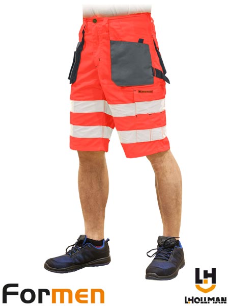 Spodnie ochronne do pasa FORMEN z krótkimi nogawkami, męskie.- materiał główny tkanina: 80% poliester, 20% bawełna (kolory CSB i CGS: 100% poliester) o gramaturze 270 g/m2- wstawki z kontrastowego materiału 100% poliester OXFORD- dwie kieszenie z tyłu na rzepy oraz dwie boczne podwójne, w tym jedna z kieszonką na telefon- jedna kieszeń na nogawce na rzepy z dodatkowymi kieszonkami na akcesoria oraz jedna boczna podłużna- końcówka do przypięcia kluczy- pętelki umożliwiające doczepienie dodatkowych akcesoriów- gumka w pasie w tylnej partii zwiększa swobodę ruchów oraz umożliwia lepsze dopasowanie- dodatkowe wzmocnienia materiałowe na kieszeniach- pasy odblaskowe zapewniające lepszą widoczność- testowane na zawartość szkodliwych dla zdrowia substancji zgodnie ze standardami OEKO-TEX® Standard 100
