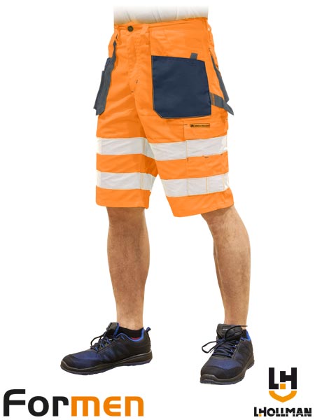 Spodnie ochronne do pasa FORMEN z krótkimi nogawkami, męskie.- materiał główny: tkanina o splocie canvas 80% poliester, 20% bawełna (kolory CSB i CGS: 100% poliester) o gramaturze 270 g/m2- wstawki: tkanina 100% poliester Oxford 600D o gramaturze 240 g/m2 oraz elementy z tkaniny 100% poliester Oxford 300D o gramaturze 175 g/m2- zapinane na guzik oraz zamek błyskawiczny- dwie podwójne kieszenie boczne z dodatkową na telefon komórkowy oraz dwie tylne zapinane na rzep- kieszenie na nogawkach, w tym jedna zapinana na rzep z przegródkami na akcesoria oraz jedna podłużna- gumka w pasie w tylnej partii umożliwiająca lepsze dopasowanie- końcówka do przypięcia kluczy- uchwyt na młotek na lewej nogawce- tkanina we fluorescencyjnym kolorze i pasy odblaskowe zwiększające widoczność- idealne dla drogowców i innych służb porządkowych- testowane na zawartość szkodliwych dla zdrowia substancji zgodnie ze standardami OEKO-TEX® Standard 100