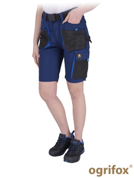 Spodnie ochronne do pasa FIO z krótkimi nogawkami, damskie.- materiał główny: tkanina o splocie canvas 80% poliester, 20% bawełna o gramaturze 260 g/m2- wstawki: tkanina 100% poliester Oxford 600D o gramaturze 200 g/m2- zapinane na guzik oraz zamek błyskawiczny- dwie podwójne kieszenie boczne z przegródkami oraz dwie tylne zapinane na rzep- dwie kieszenie na nogawkach, w tym jedna na narzędzia- gumka w pasie umożliwiająca lepsze dopasowanie- uchwyt na młotek na lewej nogawce- fason: REGULAR