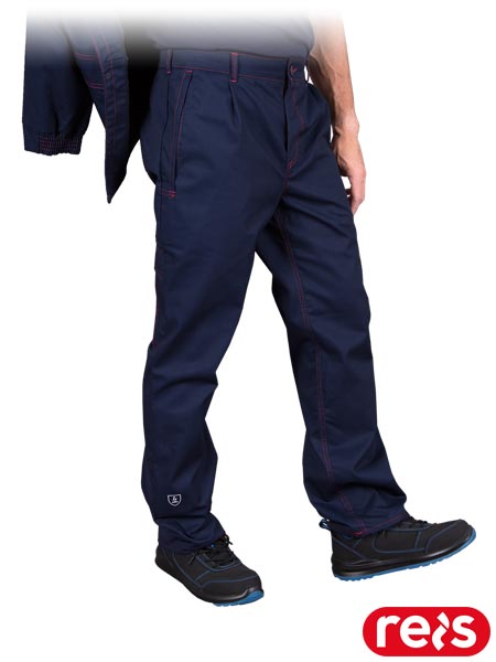 Spodnie ochronne do pasa, antyelektrostatyczne.- 64% poliester, 35% bawełna, 1% antistatic- gramatura 250 g/m2- spodnie do pasa zapinane na guziki- dwie kieszenie boczne oraz dodatkowa kieszeń na prawej nogawce- z tyłu pas z gumą do regulacji obwodu- przeznaczone do prac w środowisku, w którym wymagana jest zdolność do rozpraszania ładunku elektrostatycznego w celu zapobiegania wyładowaniom zapalającym