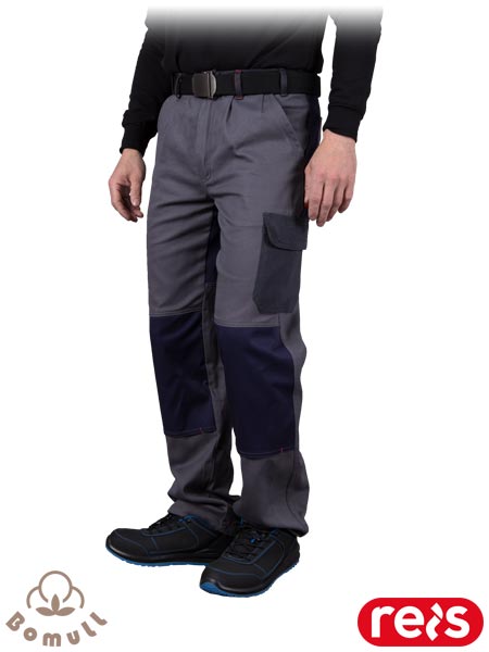 Spodnie ochronne do pasa BOMER.- tkanina: 100% bawełna o gramaturze 260 g/m2- wstawki z granatowego materiału 62% poliester, 34% bawełna, 4% spandex o gramaturze 240 g/m2- dwie boczne oraz dwie tylne kieszenie- trzy kieszenie na nogawkach, w tym jedna zapinana na rzep- gumka w pasie w bocznych partiach zwiększa swobodę ruchów oraz umożliwia lepsze dopasowanie- na kolanach kieszenie na wkładki nakolannikowe- uchwyt na młotek na lewej nogawce- dzięki zastosowaniu spandexu spodnie lepiej dopasowują się do sylwetki, jednocześnie nie krępując ruchów- idealne na upalne dni
