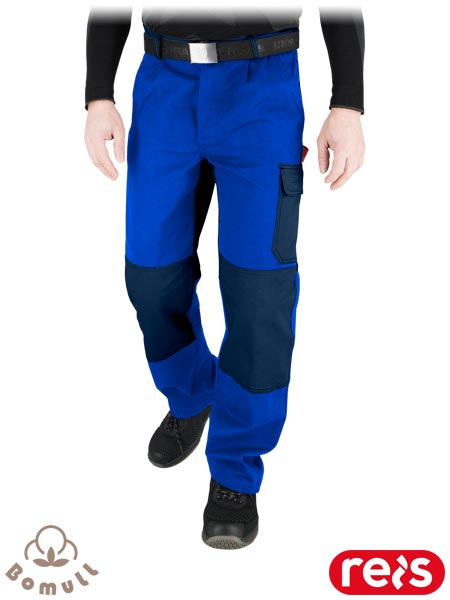 Spodnie ochronne do pasa BOMULL.- tkanina: 100% bawełna- gramatura 260-270 g/m2- sześć kieszeni: dwie boczne, dwie tylne na rzep oraz dwie na nogawkach w tym jedna na rzep- możliwość regulacji w pasie dzięki gumce w bocznych partiach- na kolanach kieszenie na wkładki nakolannikowe