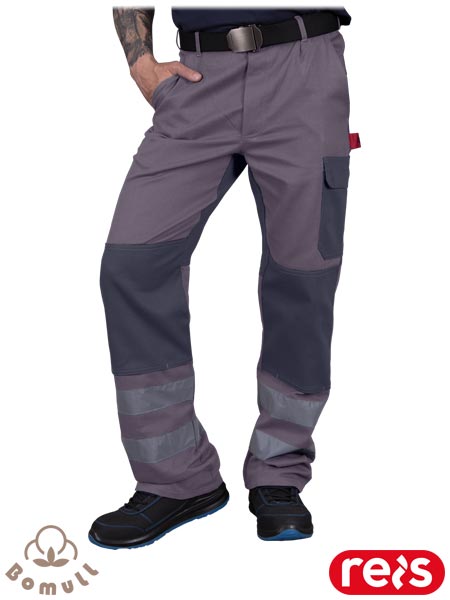 Spodnie ochronne do pasa BOMULLX.- tkanina: 100% bawełna- gramatura 260-270 g/m2- sześć kieszeni: dwie boczne, dwie tylne na rzep oraz dwie na nogawkach w tym jedna na rzep- możliwość regulacji w pasie dzięki gumce w bocznych partiach- na kolanach kieszenie na wkładki nakolannikowe- pasy odblaskowe zapewniają lepszą widoczność