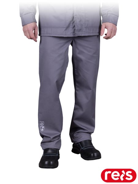 Antyelektrostatyczne spodnie ochronne chroniące przed ciekłymi chemikaliami.- 64% poliester, 34% bawełna, 2% włókna węglowe- gramatura 250 g/m2- spodnie do pasa zapinane na guziki- dwie kieszenie boczne oraz dodatkowa kieszeń na prawej nogawce- z tyłu pas z gumą do regulacji obwodu- spodnie przeznaczone do ochrony użytkownika na stanowiskach na których występuje zagrożenie ciekłymi chemikaliami w sytuacjach potencjalnego narażenia na drobno rozpyloną ciecz lub rozbryzgi o niewielkim ciśnieniu i objętości, przed którymi nie jest wymagana całkowita bariera na przenikanie cieczy na poziomie molekularnym (Typ PB[6] odzieży) oraz do prac w środowisku, w którym wymagana jest zdolność do rozpraszania ładunku elektrostatycznego w celu zapobiegania wyładowaniom zapalającym- zgodne z normami: EN ISO 13688, EN 13034, EN 1149