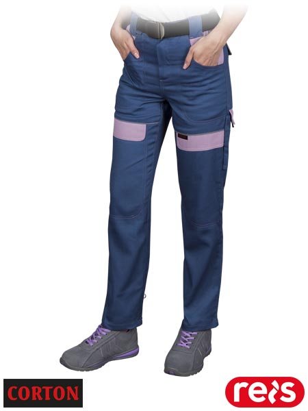 Spodnie ochronne do pasa CORTON, damskie.- tkanina: 100% bawełna- gramatura 260 g/m2- dwie boczne kieszenie oraz dwie tylne zapinane na rzep- kieszenie na nogawkach, w tym jedna na narzędzia- możliwość regulacji w pasie dzięki gumce w bocznych partiach- odblaskowe elementy