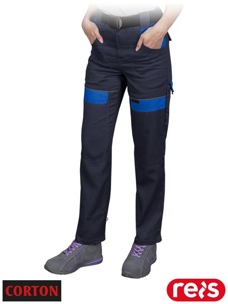 Spodnie ochronne do pasa CORTON, damskie.- tkanina: 100% bawełna- gramatura 260 g/m2- dwie boczne kieszenie oraz dwie tylne zapinane na rzep- kieszenie na nogawkach, w tym jedna na narzędzia- możliwość regulacji w pasie dzięki gumce w bocznych partiach- odblaskowe elementy