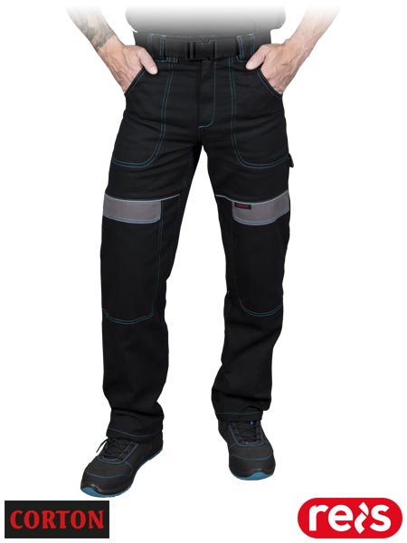 Spodnie ochronne do pasa CORTON, męskie.- tkanina: 100% bawełna- gramatura 260 g/m2- dwie boczne kieszenie oraz dwie tylne zapinane na rzep- kieszenie na nogawkach, w tym jedna na narzędzia- możliwość regulacji w pasie dzięki gumce w bocznych partiach- odblaskowe elementy- pasek w zestawie
