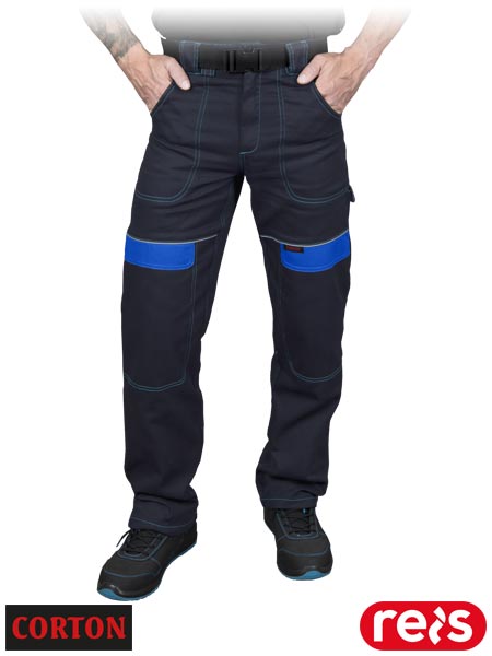 Spodnie ochronne do pasa CORTON, męskie.- tkanina: 100% bawełna- gramatura 260 g/m2- dwie boczne kieszenie oraz dwie tylne zapinane na rzep- kieszenie na nogawkach, w tym jedna na narzędzia- możliwość regulacji w pasie dzięki gumce w bocznych partiach- odblaskowe elementy- pasek w zestawie