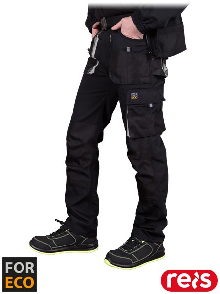 Spodnie ochronne do pasa, męskie.- materiał główny: tkanina 80% poliester, 20% bawełna o gramaturze 260 g/m2- wstawki: tkanina 100% poliester Oxford 600D o gramaturze 200 g/m2- zapinane na guzik oraz zamek błyskawiczny- dwie podwójne kieszenie boczne z przegródkami oraz dwie tylne zapinane na rzep- dwie podwójne kieszenie na nogawkach, w tym jedna podłużna- kieszenie na wkładki nakolannikowe wkładane od dołu, zapinane na rzep- gumka w pasie w bocznych partiach umożliwiająca lepsze dopasowanie- dodatkowa szlufka na akcesoria zapinana na rzep- końcówka do przypięcia kluczy- uchwyt na młotek na lewej nogawce- odblaskowe elementy zwiększające widoczność- fason: REGULAR- testowane na zawartość szkodliwych dla zdrowia substancji zgodnie ze standardami OEKO-TEX® Standard 100