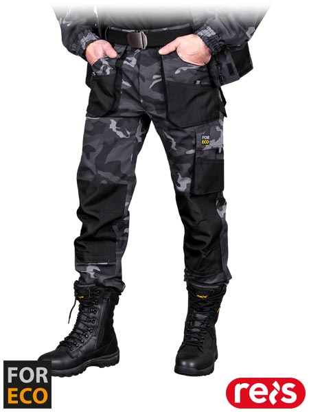 Spodnie ochronne do pasa, męskie.- materiał główny: tkanina 80% poliester, 20% bawełna o gramaturze 260 g/m2- wstawki: tkanina 100% poliester Oxford 600D o gramaturze 200 g/m2- zapinane na guzik oraz zamek błyskawiczny- dwie podwójne kieszenie boczne z przegródkami oraz dwie tylne zapinane na rzep- dwie podwójne kieszenie na nogawkach, w tym jedna na narzędzia- kieszenie na wkładki nakolannikowe wkładane od dołu, zapinane na rzep- gumka w pasie w bocznych partiach umożliwiająca lepsze dopasowanie- dodatkowa szlufka na akcesoria zapinana na rzep- końcówka do przypięcia kluczy- uchwyt na młotek na lewej nogawce- odblaskowe elementy zwiększające widoczność- testowane na zawartość szkodliwych dla zdrowia substancji zgodnie ze standardami OEKO-TEX® Standard 100