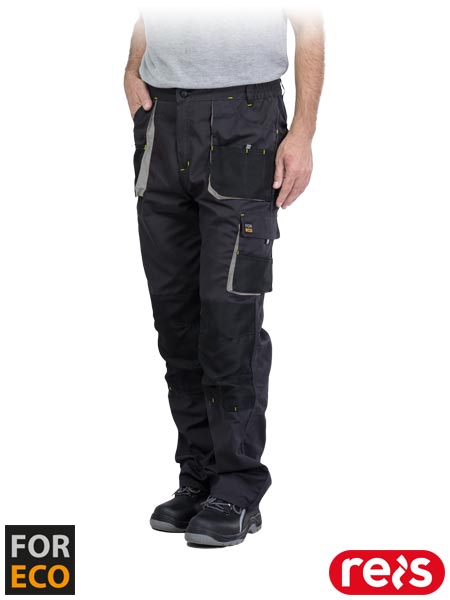Spodnie ochronne do pasa, męskie.- materiał główny: tkanina 80% poliester, 20% bawełna o gramaturze 260 g/m2- wstawki: tkanina 100% poliester Oxford 600D o gramaturze 200 g/m2- zapinane na guzik oraz zamek błyskawiczny- dwie podwójne kieszenie boczne z przegródkami oraz dwie tylne zapinane na rzep- dwie podwójne kieszenie na nogawkach, w tym jedna podłużna- kieszenie na wkładki nakolannikowe wkładane od dołu, zapinane na rzep- gumka w pasie w bocznych partiach umożliwiająca lepsze dopasowanie- dodatkowa szlufka na akcesoria zapinana na rzep- końcówka do przypięcia kluczy- uchwyt na młotek na lewej nogawce- odblaskowe elementy zwiększające widoczność- fason: REGULAR- testowane na zawartość szkodliwych dla zdrowia substancji zgodnie ze standardami OEKO-TEX® Standard 100